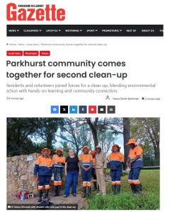 ”Parkhurst community rallies for a cleaner, greener future” (Naziya Davids-Easthorpe, 10 March 2025). Read more about this in the Rosebank Killarney GazetteLink: https://www.citizen.co.za/rosebank-killarney-gazette/news-headlines/2025/03/10/parkhurst-residents-unite-for-a-cleaner-greener-suburb/